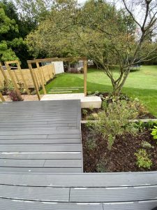 - Elevated composite decking featuring tiers and integrated steps for a dynamic outdoor experience.